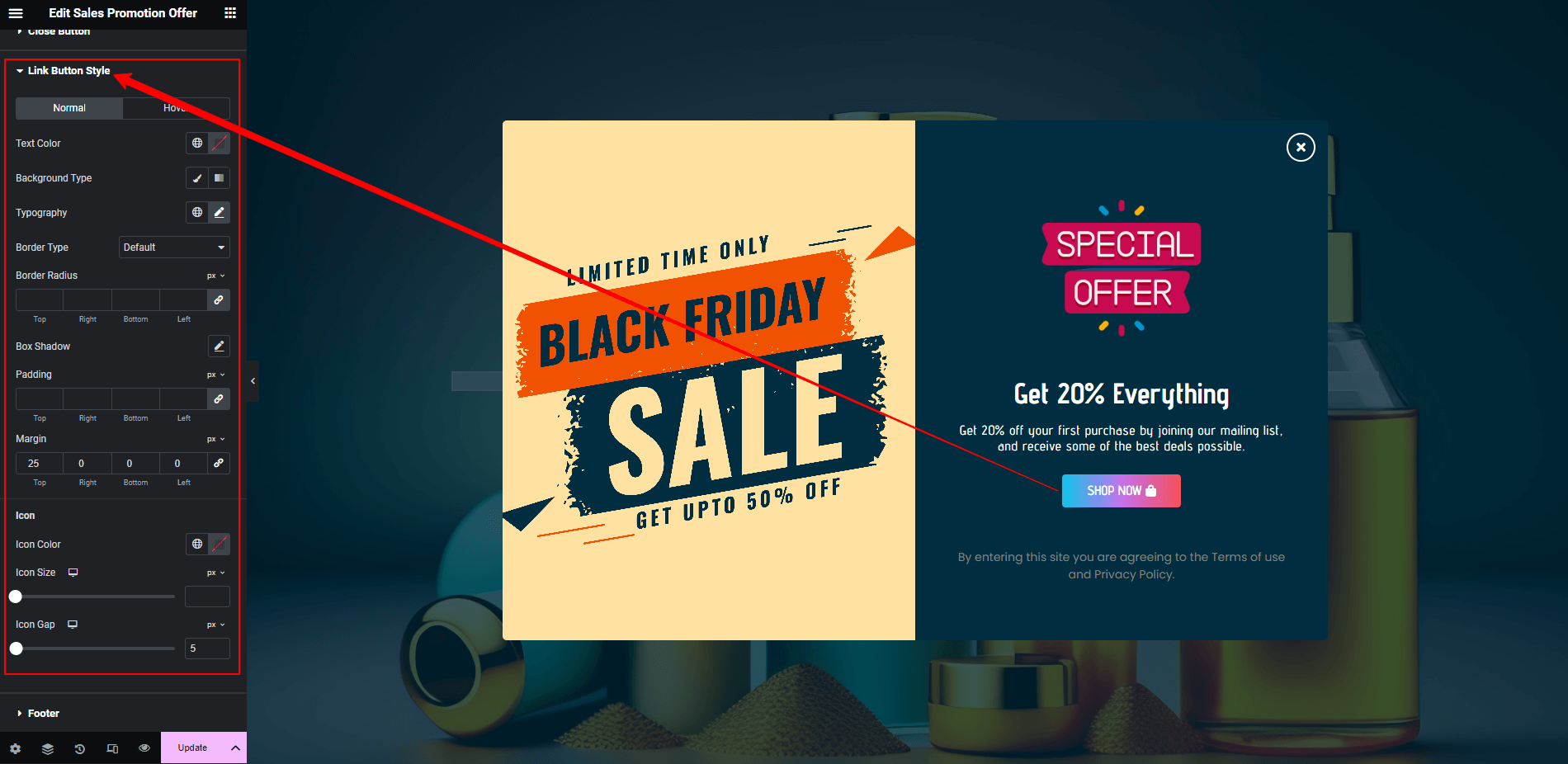 According to the Sales Promotion Offer Popup link button styles, you can control the Link Button options. For example, if you need Sales Promotion Offer Popup Link Button for linking the others product or page,, you can add button text and button custom link and open link new window option and icon with its position and align the button position.